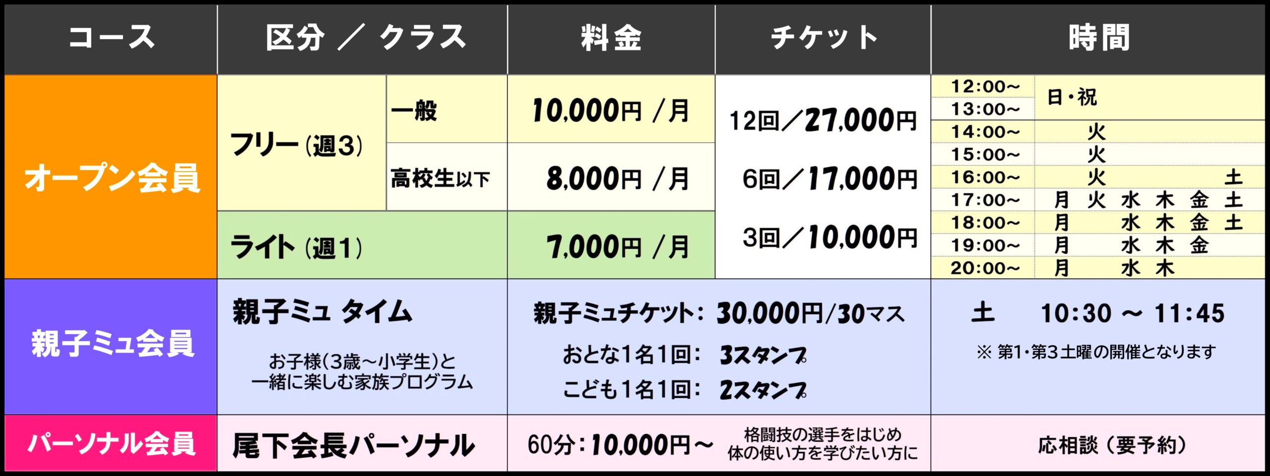 | オープン会員 フリー | 10,000円/月 (高校生以下)8,000円/月 |